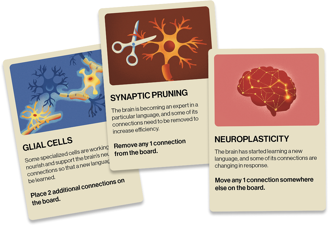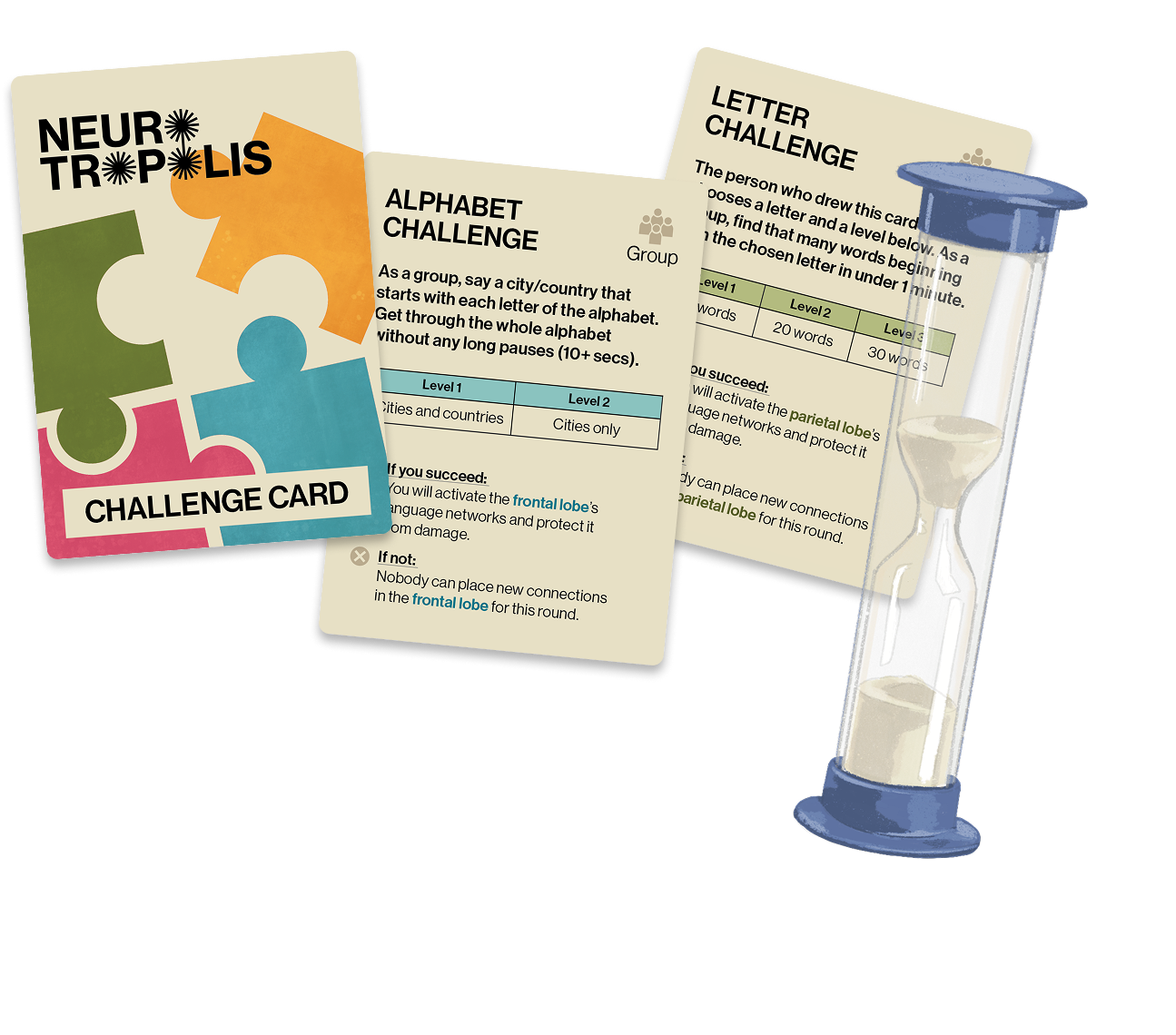 Every round, players are met with events that affect the brain in unforeseeable ways. They must face individual and group challenges to protect their neural networks.