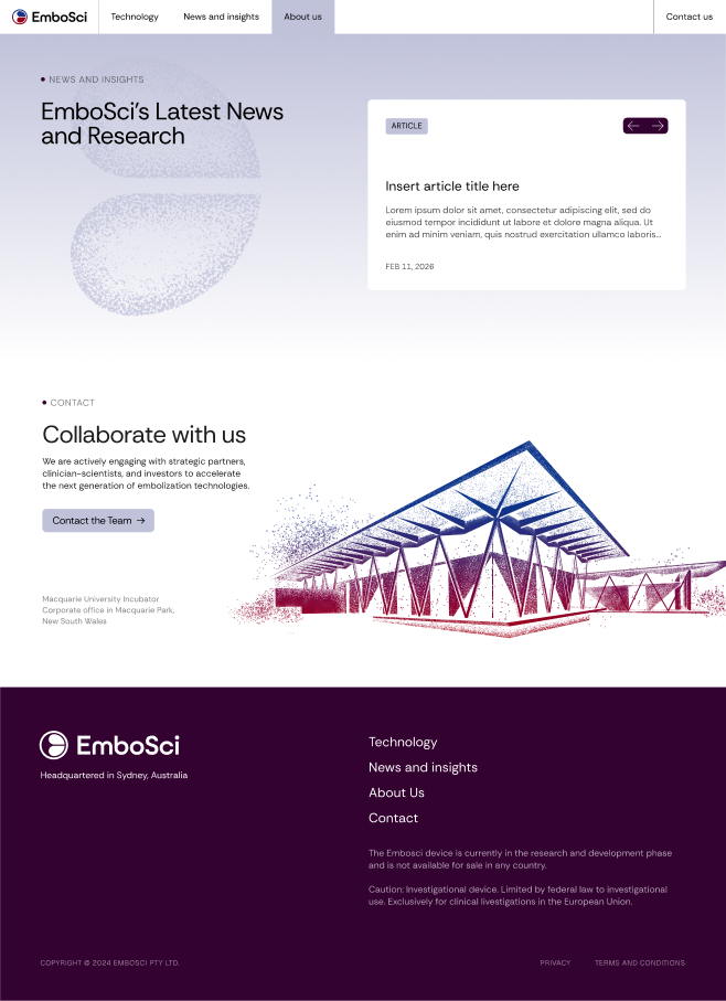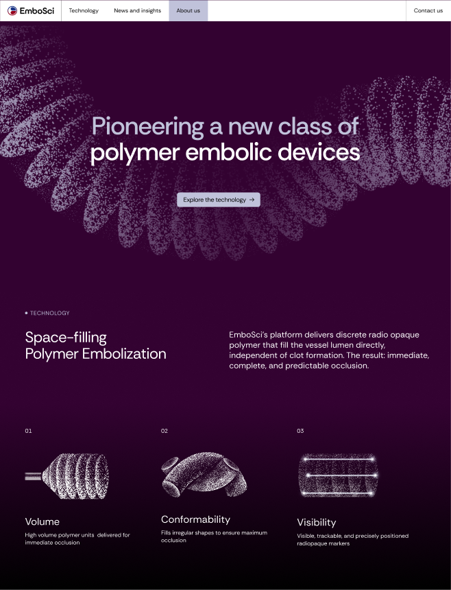 EmboSci is an Australian medical device start-up developing a next-generation polymer-based embolisation solution. The technology has been designed to redefine how blood flow is controlled within the body. Fresh out of seed funding and approaching first-in-man clinical trials, the company needed a brand identity that could speak credibly to med-tech investors, strategic partners, and clinician-scientists alike.